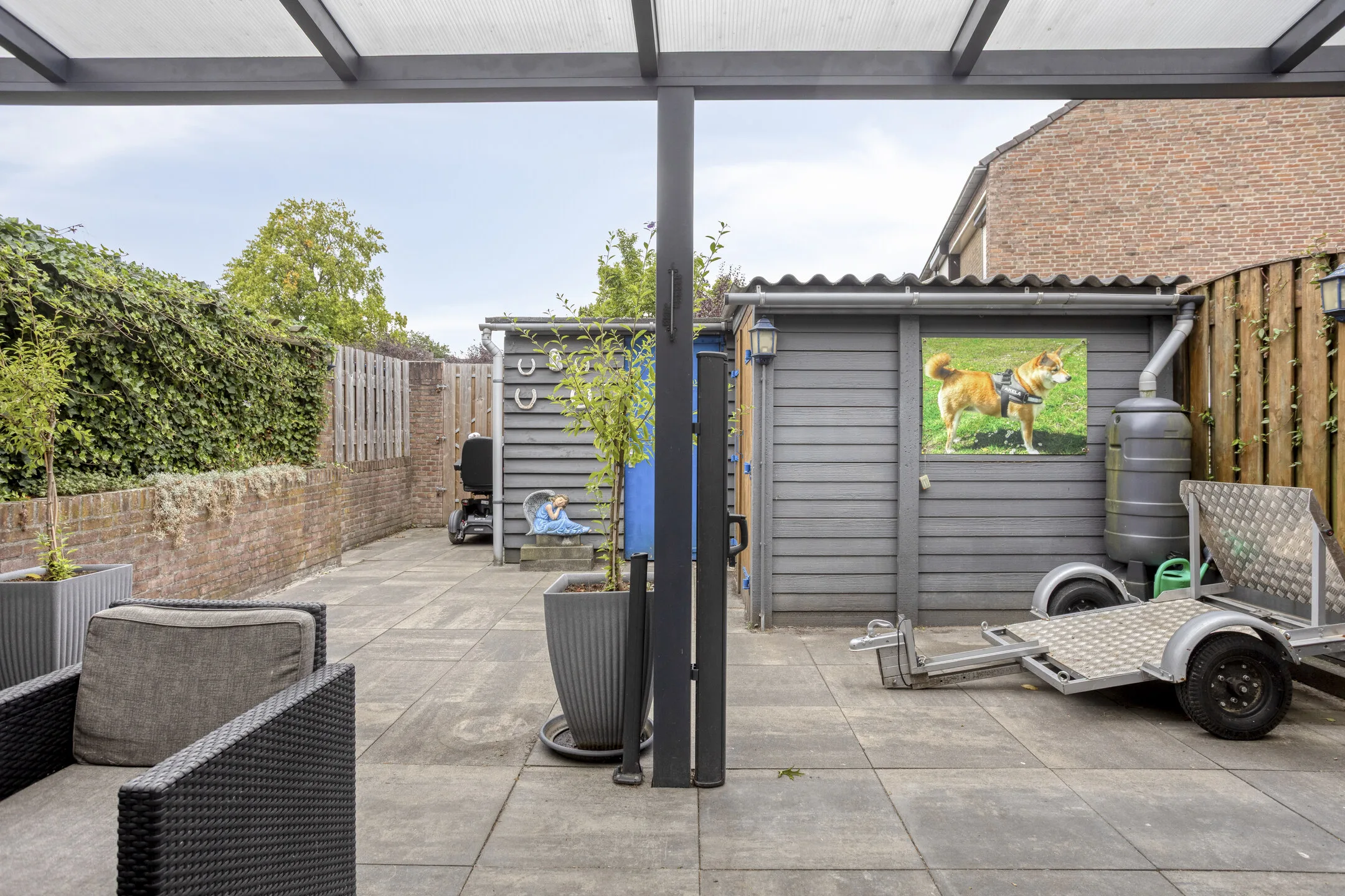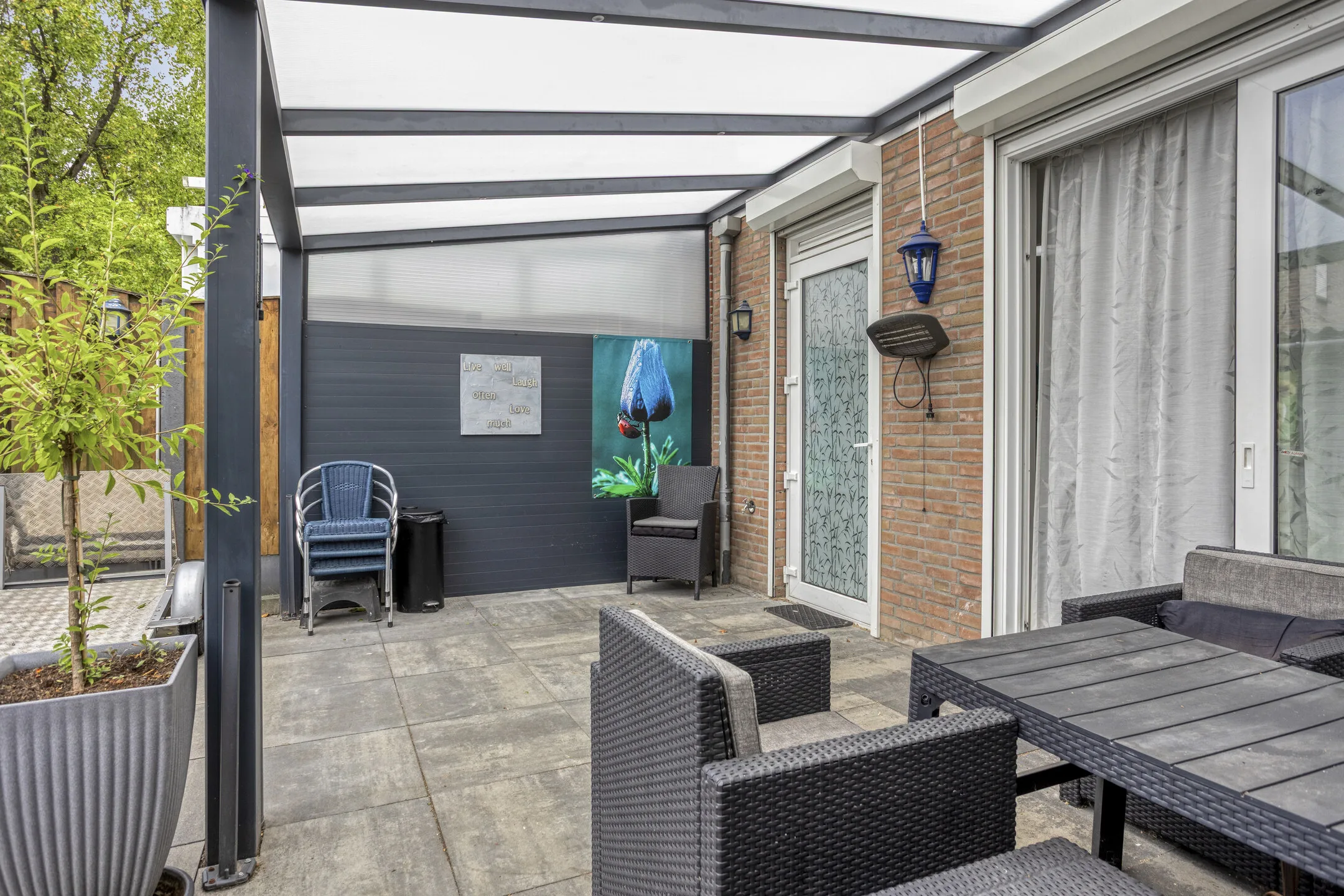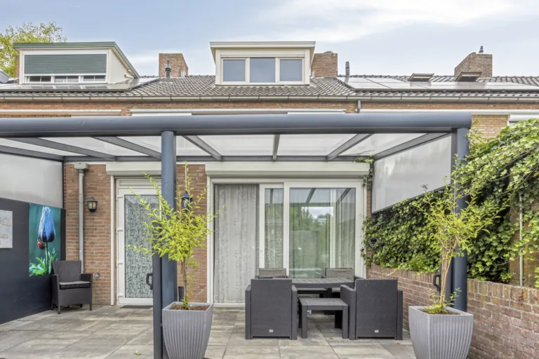Tuin: Zonnige achtertuin op het zuidoosten gelegen, geheel bestraat en met brede afsluitbare achterom naar de brandgang. Hierdoor kun je gemakkelijk met een motor of scooter achterom. Mede door de gunstige ligging heb je geen directe inkijk van de achterburen. Het hele jaar door kun je fijn onder de aluminium overkapping zitten.