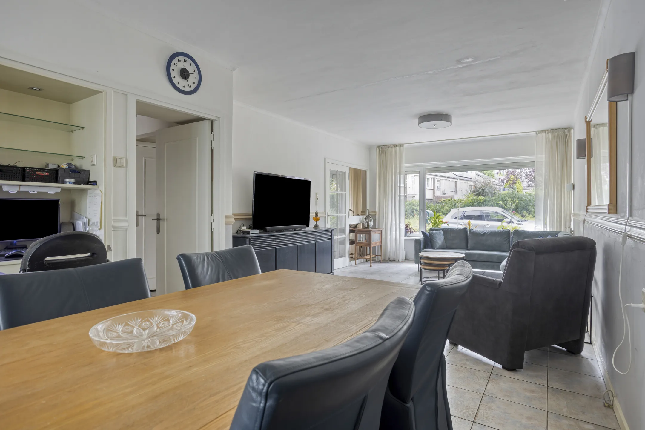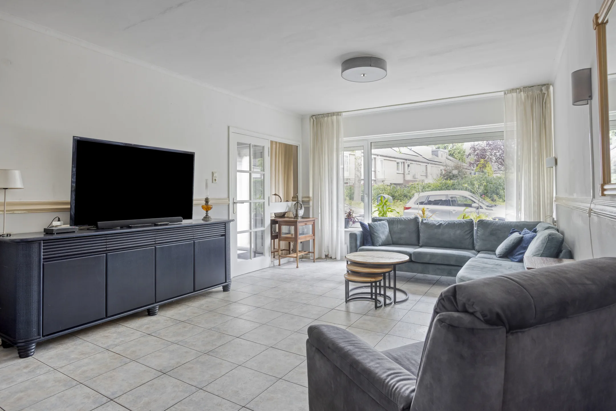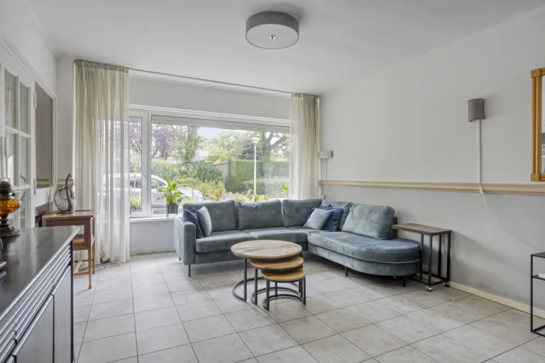 Living: Vanuit de hal kom je binnen in de royale living. De ruimte is lekker licht door de grote raampartij aan de voorzijde. Wandafwerking met stucwerk voorzien van lambrisering en tegelvloer met vloerverwarming.