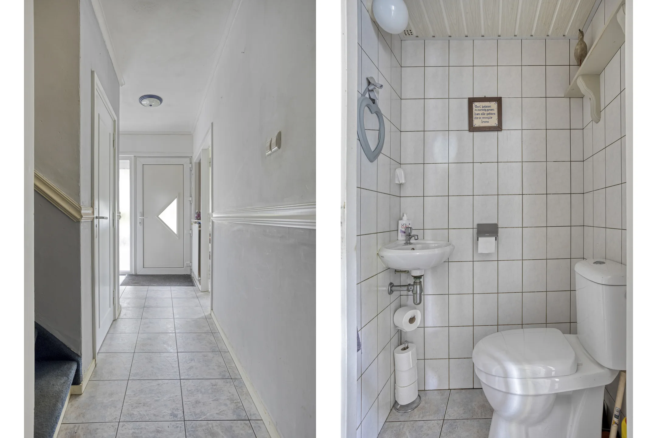Entree/hal: Overdekte entree. Ontvangsthal met garderobehoek en trap naar de eerste verdieping. Betegeld toilet met staand closet en fonteintje.