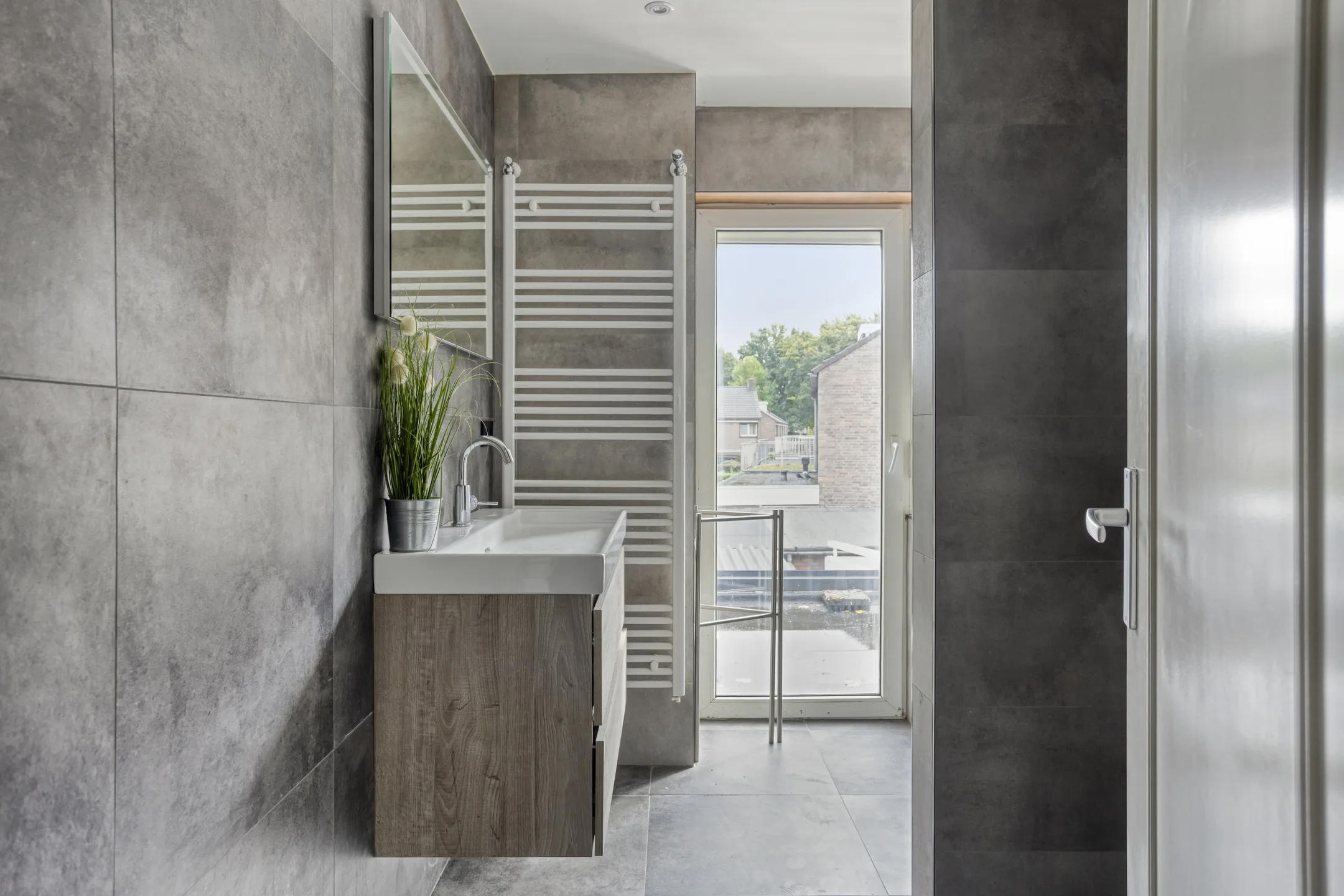 Badkamer: Moderne betegelde badkamer in hedendaagse grijs-bruine kleurstelling. Ruimtelijk ingericht met luxe badmeubel, fraaie designradiator en royale inloopdouche met regendouche. Een tweede toilet (sanibroyeur) maakt het geheel compleet. De kantelbare loopdeur richting het platte dak zorgt voor natuurlijke ventilatie.