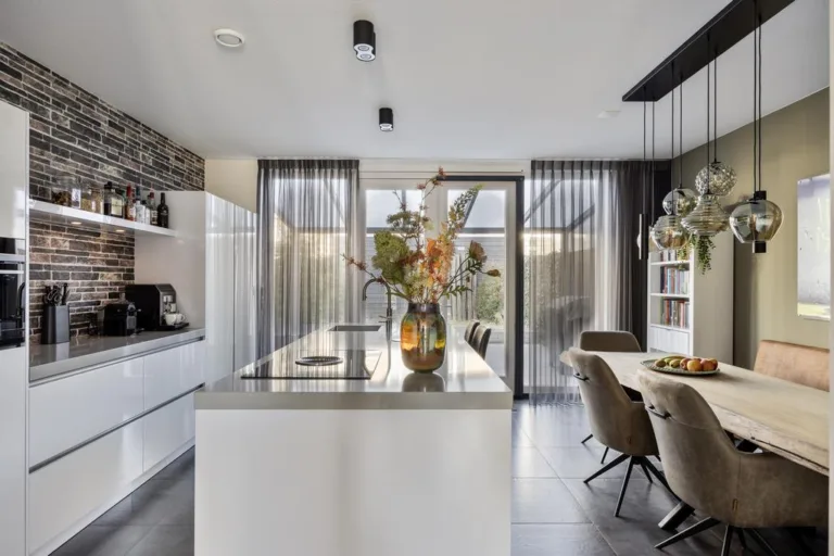 Keuken: Luxe keukeninrichting in dubbele opstelling met prachtig kookeiland, eetbar, composieten werkbladen en afgewerkt met kwalitatief hoogwaardige materialen. Fijne dubbele tuindeuren naar het overdekte terras. Er is meer dan voldoende plek voor een grote eethoek. De keuken is heel smaakvol ingericht en van alle gemakken voorzien voor een heerlijk culinair avondje met familie en vrienden. Kortom: het ideale domein van een ieder die van koken, gezelligheid en lekker eten houd!