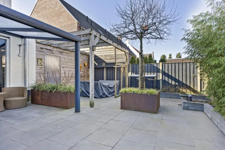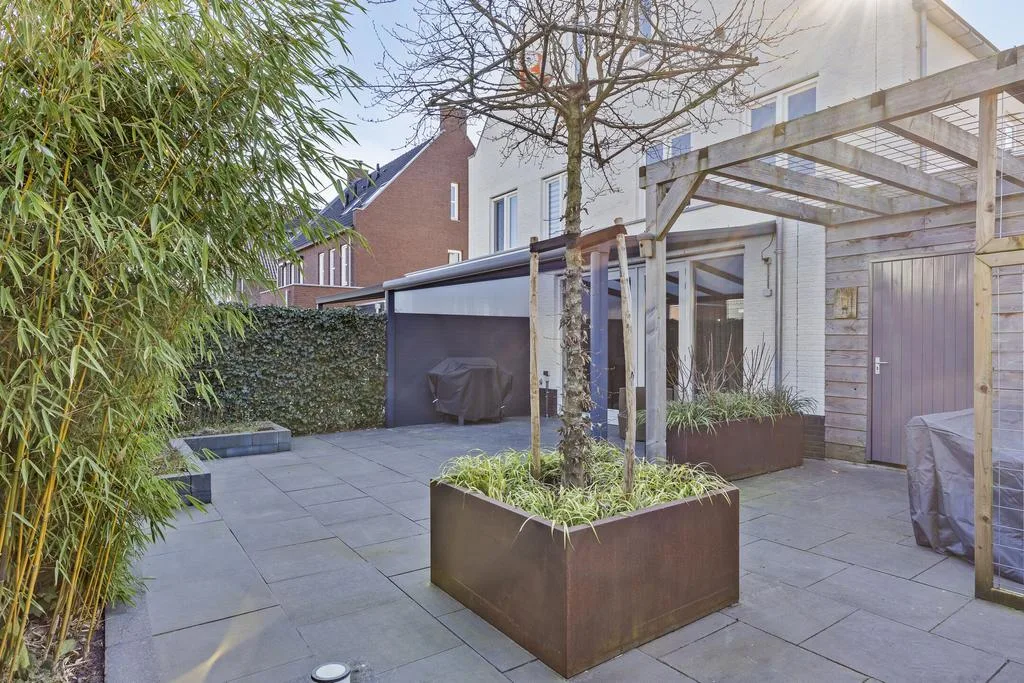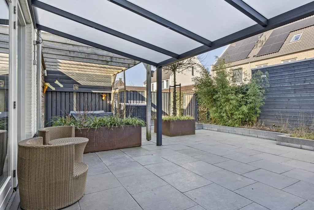 Tuin: Fraai aangelegde bestraatte tuin met verhoogde plantenborders, cortenstaal plantenbakken en een houten pergola. Het terras wordt overdekt met een aluminium overkapping waardoor je gedurende het hele jaar door lekker van de tuin kunt genieten. Deur naar de berging. Achterom met afsluitbare poort.