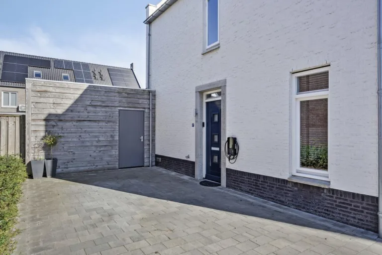 Aangelegde voortuin met oprit, oplaadpunt voor een elektrische auto en toegang tot de berging en de tuin.