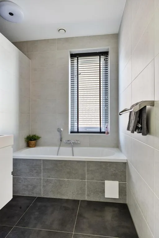 Badkamer: Modern afgewerkt in hedendaagse tinten! Luxe badkamer welke van alle gemakken is voorzien zoals een ligbad met douchefunctie waarin je lekker tot rust kunt komen. Fraai badmeubel in strakke witte kunststof uitvoering en bijbehorende verlichte spiegel waar je met gemak met 2 personen tegelijk je kunt opfrissen. De designradiator, vloerverwarming en de comfortabele hoekdouche met thermostaatkraan en regendouche maken het geheel compleet. Een mechanische afzuiging en een raam zorgen voor de nodige (natuurlijke) ventilatie.