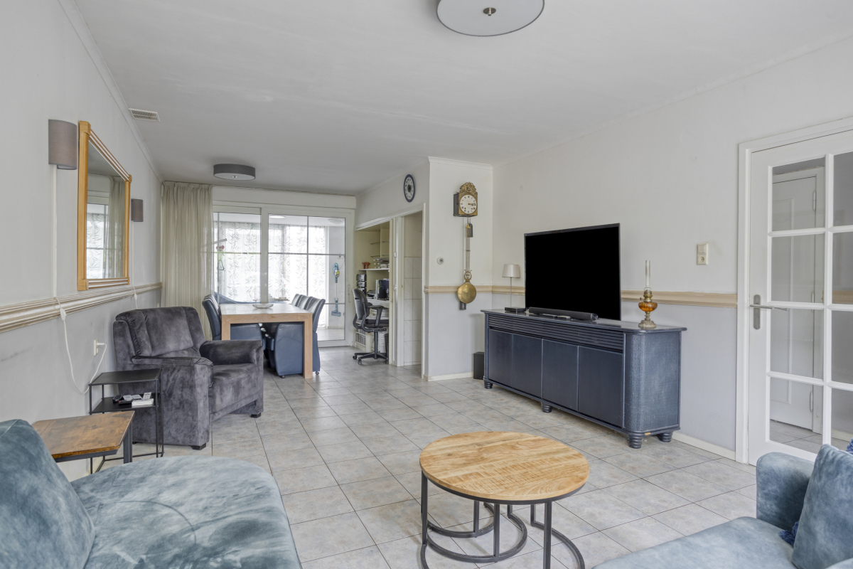 Living: Vanuit de hal kom je binnen in de royale living. De ruimte is lekker licht door de grote raampartij aan de voorzijde. Wandafwerking met stucwerk voorzien van lambrisering en tegelvloer met vloerverwarming.