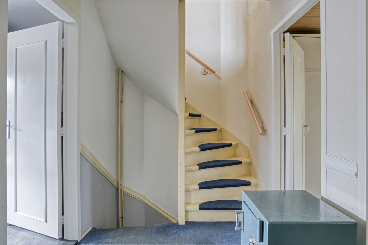 Entree/hal: Overdekte entree. Ontvangsthal met garderobehoek en trap naar de eerste verdieping. Betegeld toilet met staand closet en fonteintje.