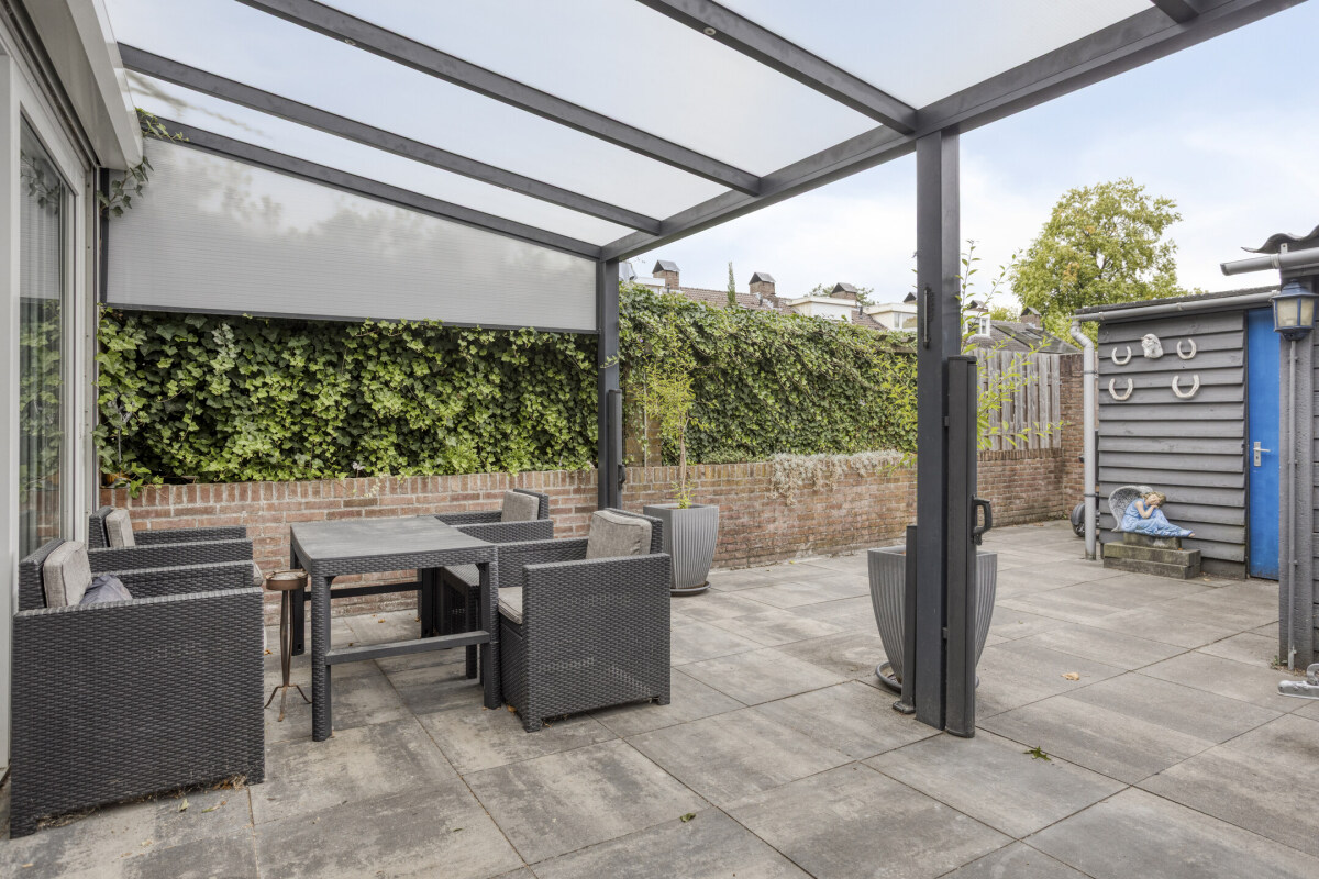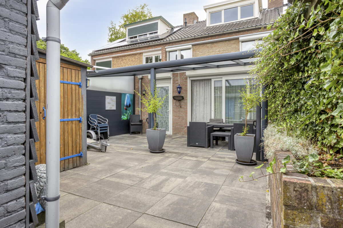 Tuin: Zonnige achtertuin op het zuidoosten gelegen, geheel bestraat en met brede afsluitbare achterom naar de brandgang. Hierdoor kun je gemakkelijk met een motor of scooter achterom. Mede door de gunstige ligging heb je geen directe inkijk van de achterburen. Het hele jaar door kun je fijn onder de aluminium overkapping zitten.