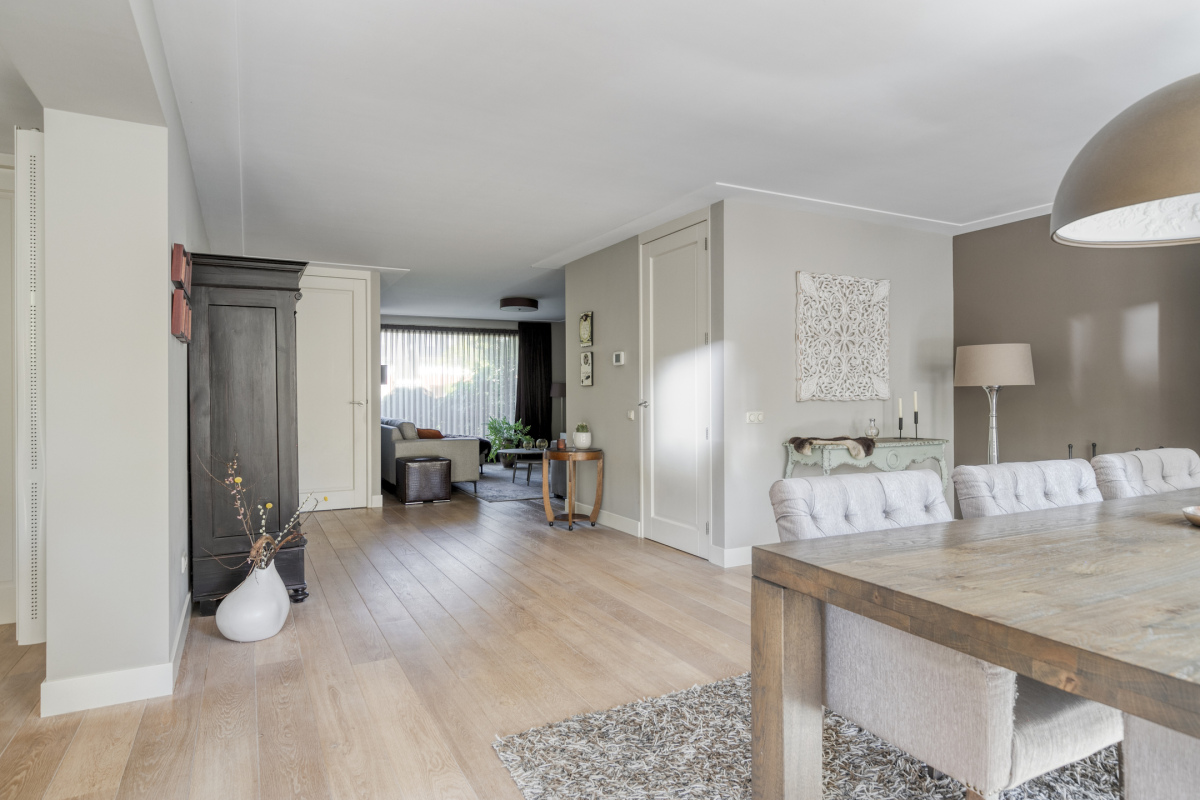 Alle wanden zijn voorzien van glad stucwerk en de plafonds zijn strak afgestuct met sierlijsten. De gehele begane grond is doorgelegd met moderne eikenhouten vloerdelen.
